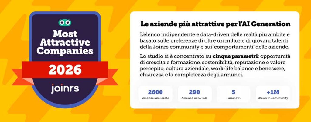 Come sottolineato da Gabriele Giugliano, Co-founder e CEO di Joinrs: «Dopo la Digital Generation emerge l’AI Generation, una nuova onda di talenti che cresce con l’intelligenza artificiale integrata nel proprio modo di pensare, ricercare un impiego e selezionare dove lavorare. Con oltre 1 milione di persone solo in Italia (nel mondo superano i 2 milioni) all’interno della nostra community, e dai dati emersi dal Joinrs Data Loop, osserviamo esigenze nuove: trasparenza, sviluppo continuo e cultura autentica. Questa lista fotografa ciò che cercano davvero e indica alle aziende dove si gioca oggi la vera attrattività».
